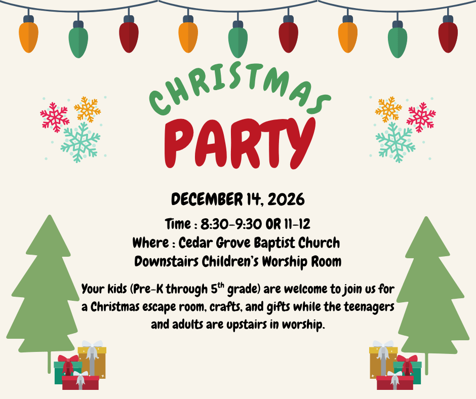 We would love for Pre-K through 5th graders to join us for a Christmas party downstairs during worship. We will do a Christmas escape game focused on Jesus’ birth, make a craft, and, of course, open some presents 🙂