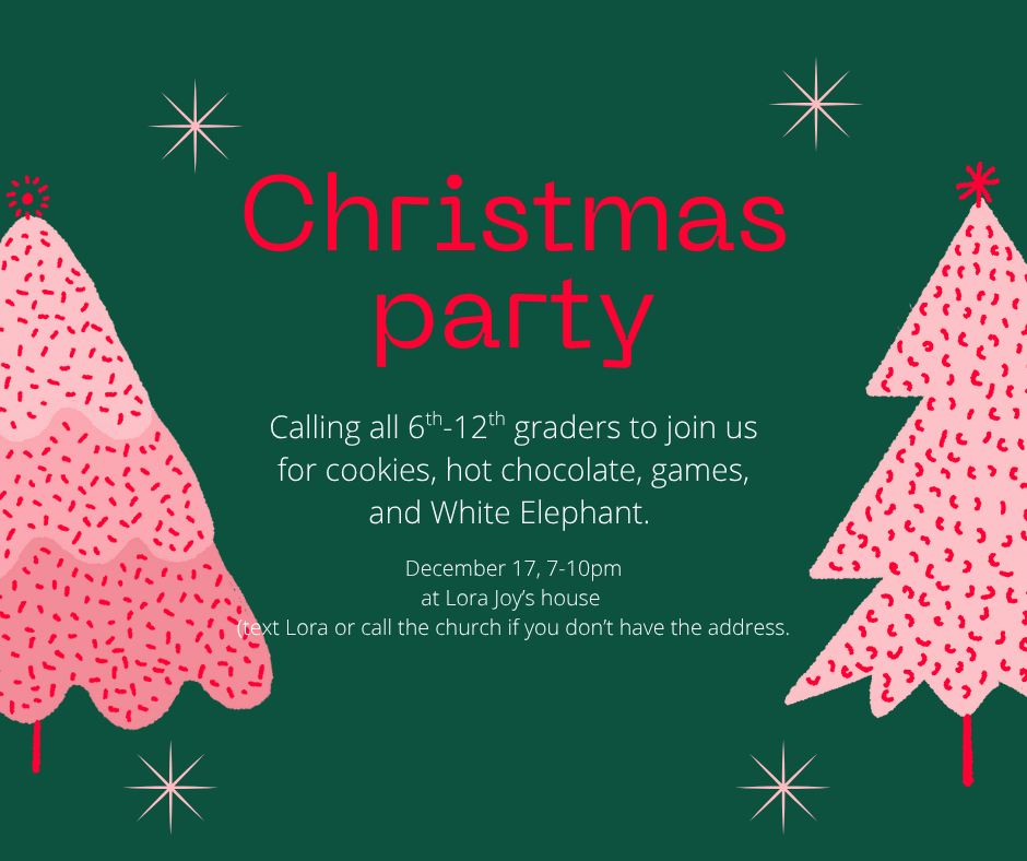 December 17th from 7pm-10pm Lora Joy is hosting all of the 6th-12th graders for a Christmas party. We will decorate sugar cookies, have a hot chocolate bar, compete in games, and, of course, open Christmas presents. Text Lora Joy or call the church for the address.